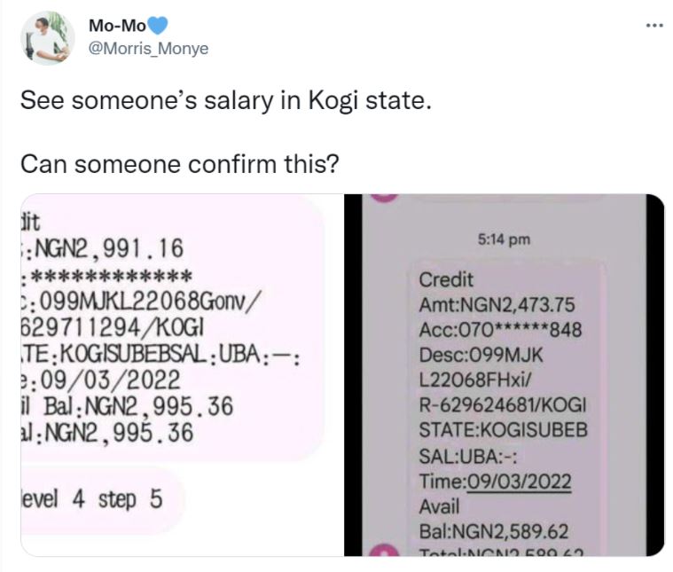 Some Twitter users have shared screenshots of the alleged salaries earned by Kogi state civil servants.