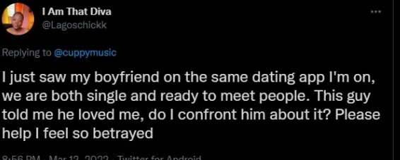 A young woman has gone online to bemoan her betrayal after discovering that her boyfriend is on the same dating platform as herself.