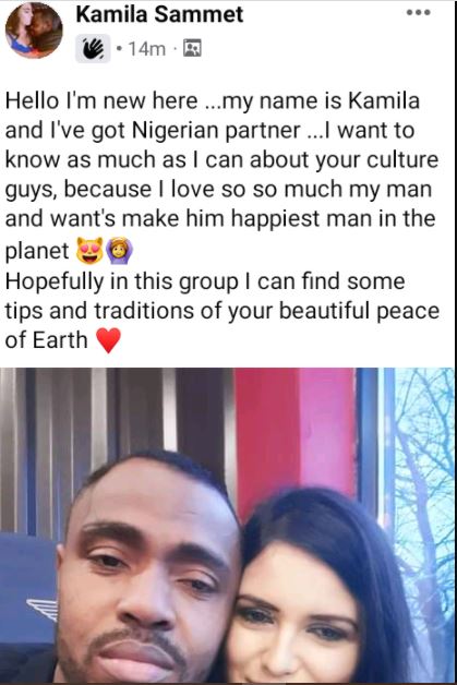 "Hello I'm new here ...my name is Kamila and I've got Nigerian partner ...I want to know as much as I can about your culture guys, because I love so so much my man and want to make him happiest man in the planet.