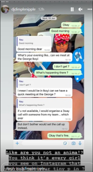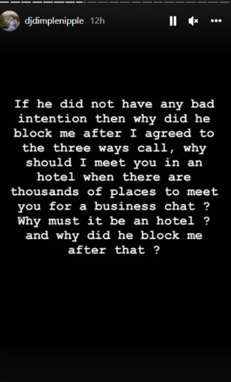 In a series of posts on her Instagram story, DJ Dimple Nipple claimed that the artiste had invited her to a hotel to discuss business but she declined and instead demanded a three-way call.