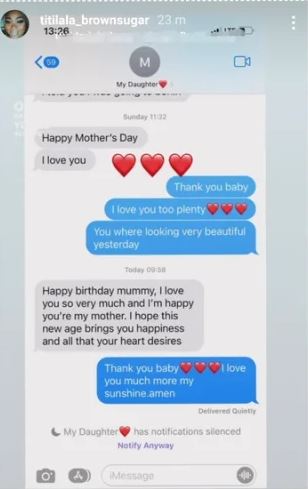 In her response, Titi thanked her daughter for the message, while stating that she loves her very much also.