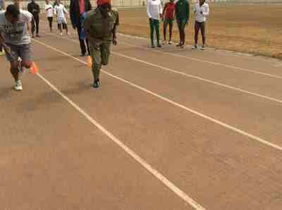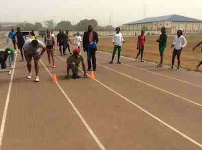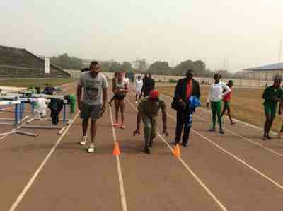 Minister of Youth and Sports, Barr Solomon Dalung pictured in a 50m race with one of the High Performance Camp coaches, Eric Campbell during his visit to the center at the University of Port Harcourt, Rivers state recently.