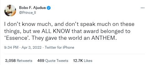 “I don’t know much, and don’t speak much on these things, but we all know that award belonged to ‘Essence’. They gave the world an Anthem”