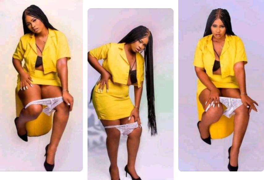 A photoshoot in which a lady posed in her panties has sparked mixed reactions online. In the photo, the lady who wore a yellow top and skirt with a black bralet, posed with her panties slightly below her thighs.