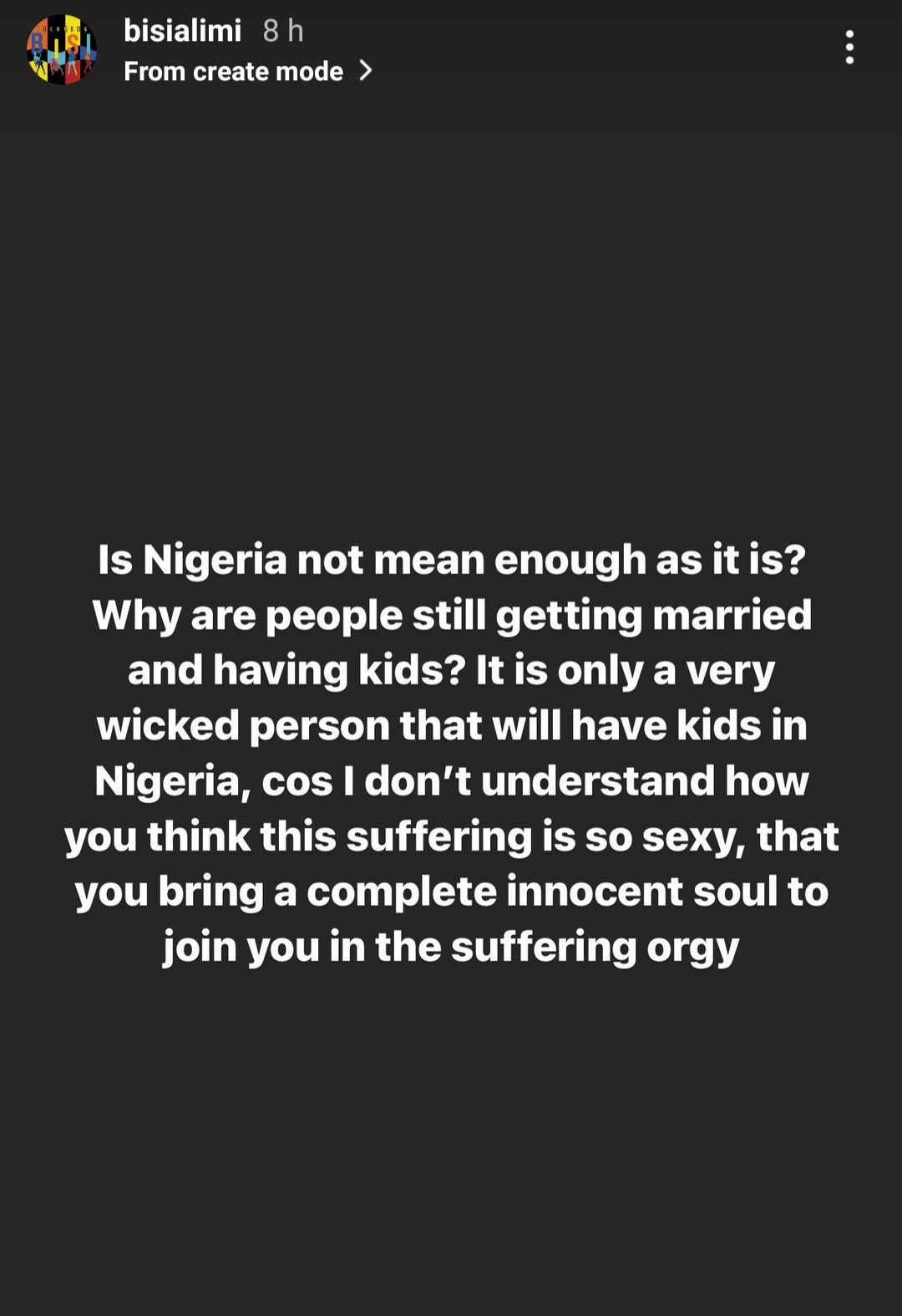 According to him, it is only a ''wicked soul'' that will bring a child into a country like Nigeria to participate in the ''suffering orgy''.