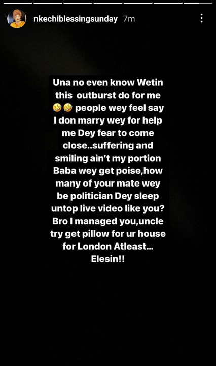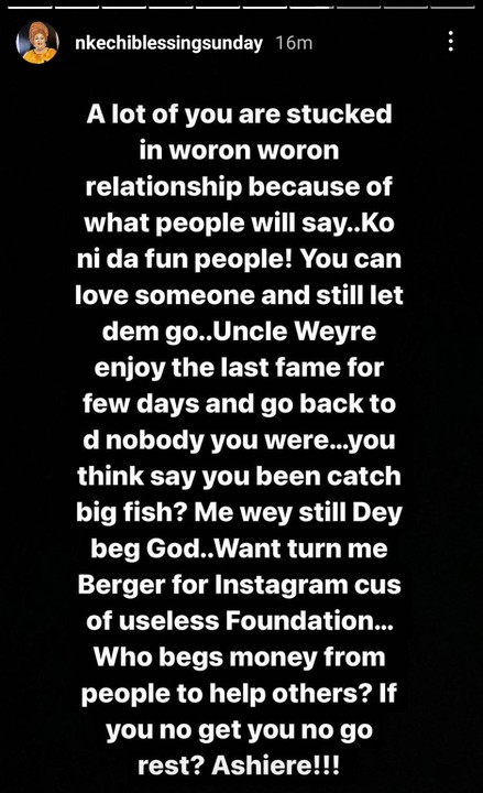 Nkechi Blessing in her latest post claimed she has been feeding Falegan and footing his bills.