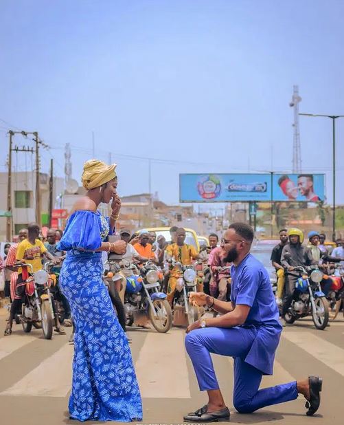 A video has captured the adorable moment a man went on his knees in the middle of the road in Ibadan, Oyo state capital to ask his girlfriend to marry him.