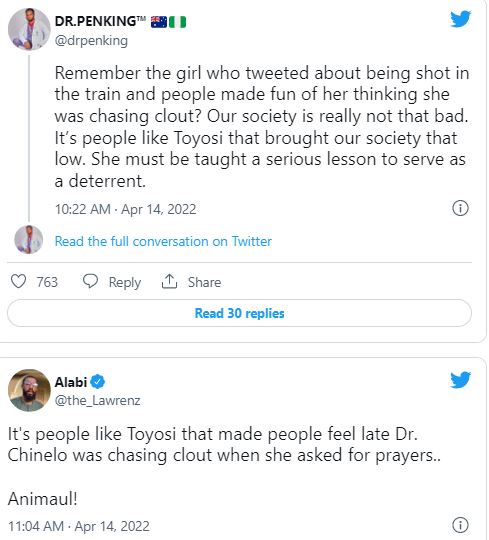 Her prank comes in the wake of a distress tweet sent by Dr Chinelo Megafu who was killed in the recent Abuja-Kaduna train attack. Many had assumed Chinelo was clout-chasing after she tweeted that she had been shot by terrorists who attacked the train.