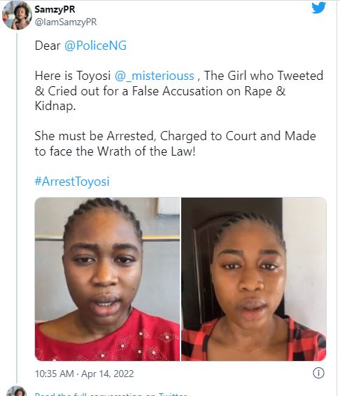 “I’m being kidnapped guys. I’m being raped. Number 78 Obayan Street, Pako, Akoka, Lagos,” she wrote in the now-deleted tweet.