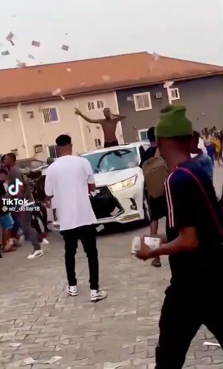 A young Nigerian man has caused commotion after he was spotted throwing money at people from the roof of a multimillion naira Lexus car.