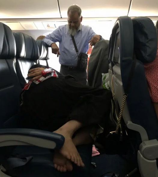 A photo has been shared online of a Caucasian man who reportedly stood up for 6 hours in an airplane so his wife could sleep.