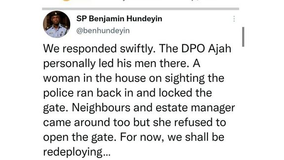 Spokesperson of the state police command, SP Benjamin Hundeyin, in a series of tweets said the DPO in Ajah led a team of officers to the address she listed but were unable to reach her.
