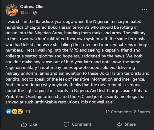 In a Facebook post, he revealed that the reason the military is losing the war against insecurity is as a result of the unethical decision of the government to recruit terrorists into the army.