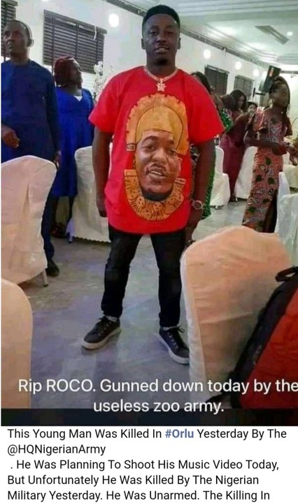 Another musician, Uche Ndum, popularly known as Tooblac, who is a friend of the victim said “The Nigerian army has just killed my friend Roco two hours ago in orlu. This is so disheartening. I lack words right now.”