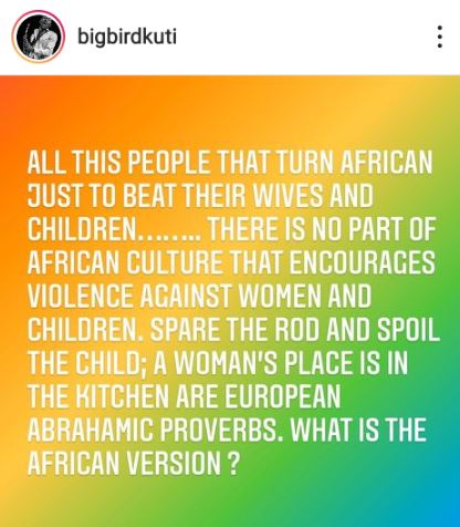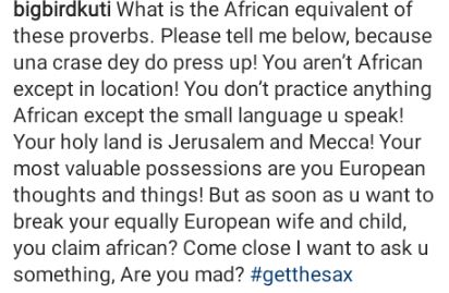 "What is the African equivalent of these proverbs. Please tell me below, because una crase dey do press up! You aren’t African except in location! You don’t practice anything African except the small language u speak! Your holy land is Jerusalem and Mecca! Your most valuable possessions are you European thoughts and things! But as soon as u want to break your equally European wife and child, you claim african? Come close I want to ask u something, Are you mad?"