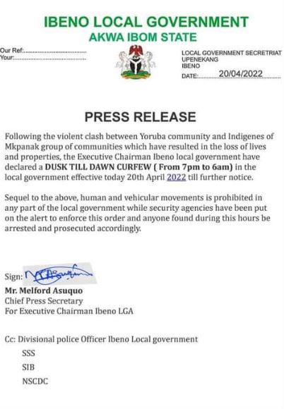 "Following the violent clash between the Yoruba community and indigenes of Mkpanak group of communities in Ibeno council area, which has resulted in the loss of lives and properties, the executive chairman of Ibeno Local Government Area has declared a dusk-to-dawn curfew from 7:00 p.m. till 6:00 a.m. with immediate effect till further notice." the statement read.