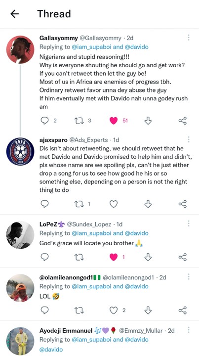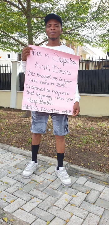 "This is Supaboi, King David you brought me to your lekki home in 2018, promised to help me that ileya day I won your rap battle. Abeg Davido Help!!"