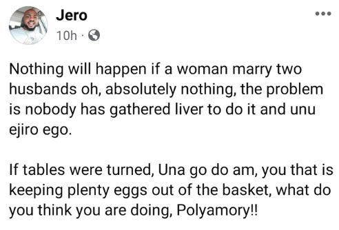 A Nigerian man has opined that nothing will happen if a woman decides to marry two husbands.