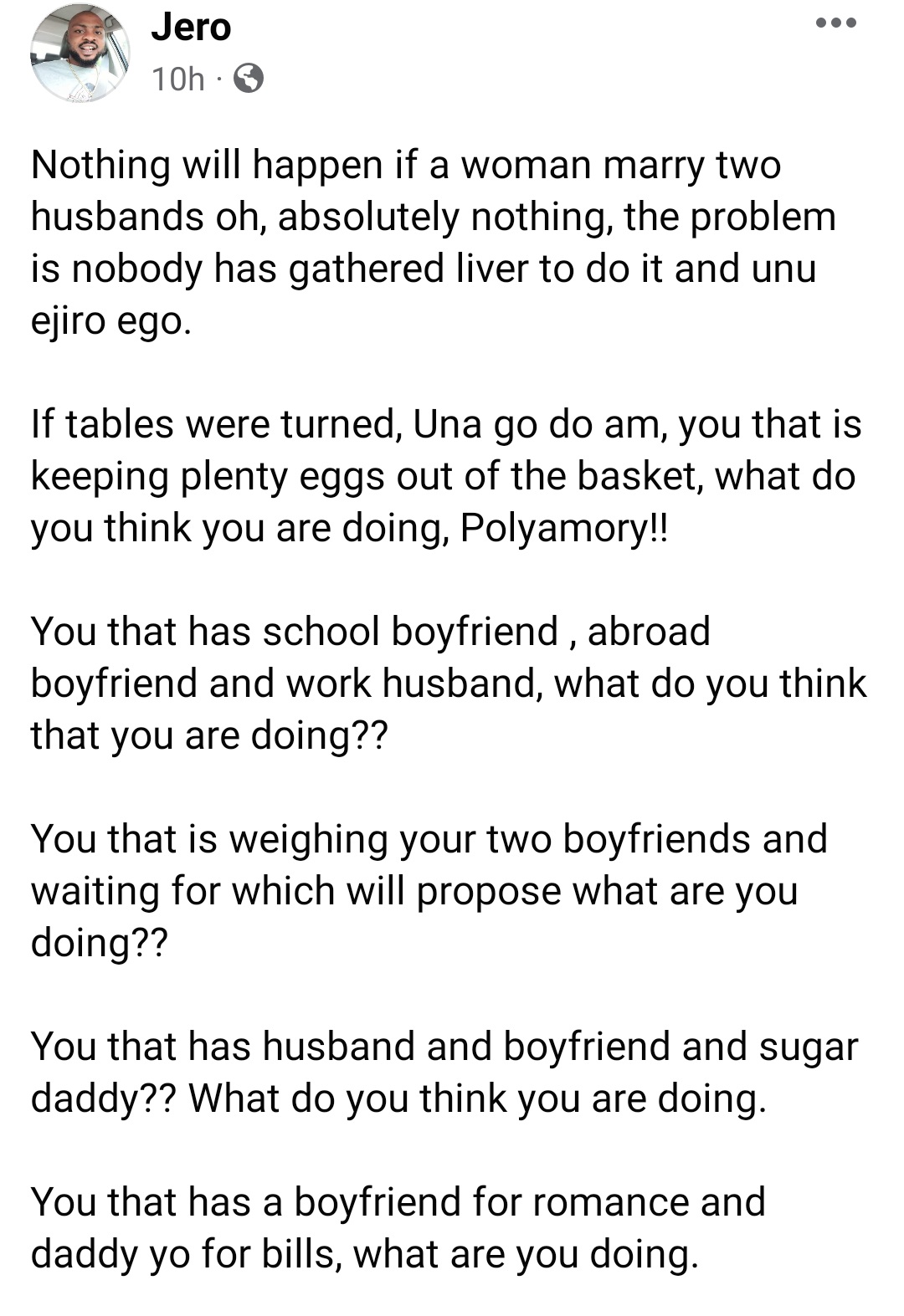 If tables were turned, Una go do am, you that is keeping plenty eggs out of the basket, what do you think you are doing, Polyamory!!