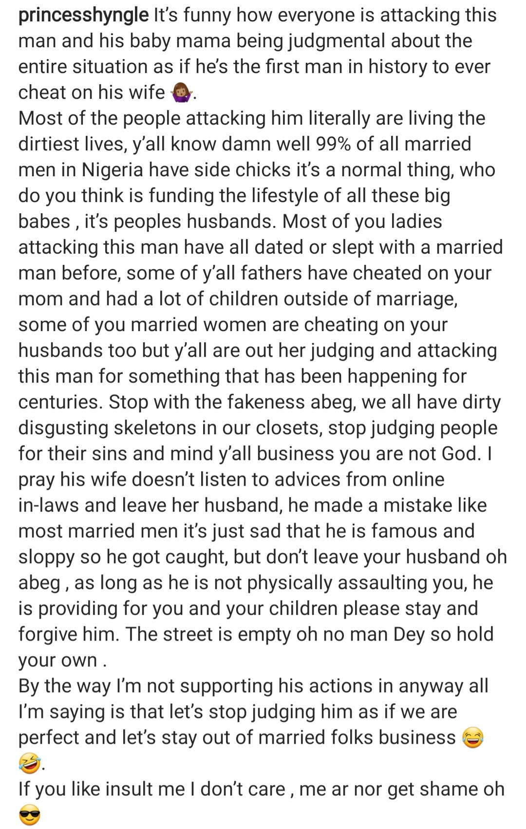 Shyngle, who left her own husband just weeks after getting married, wrote: "Please stay and forgive him. The street is empty o. No man dey so hold your own."