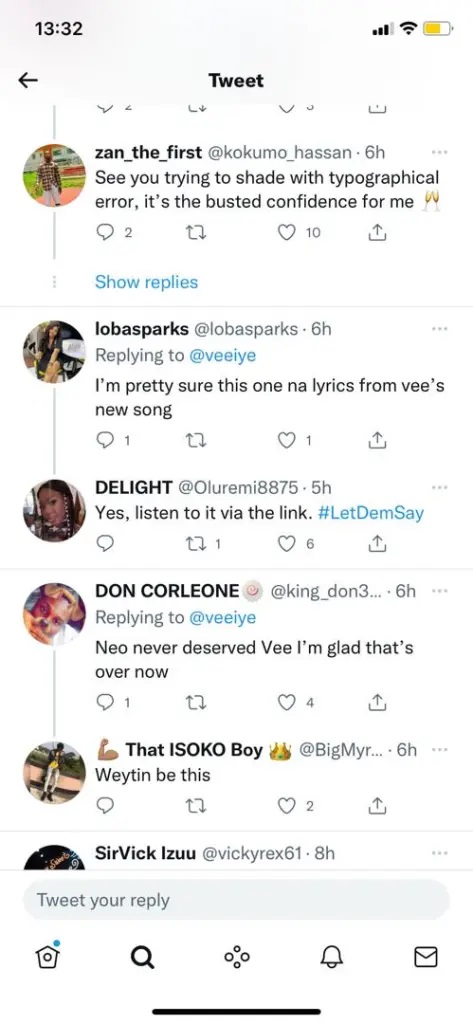 Vee had taken to Twitter on Friday to tweet lyrics from her newly released track “Let them say“, but many assumed that the post was a dig at her estranged lover, Neo.