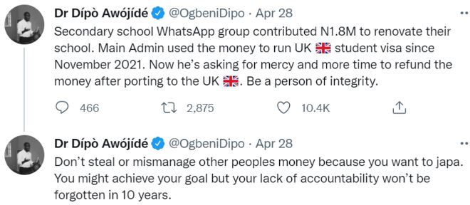 He tweeted; Secondary school WhatsApp group contributed N1.8M to renovate their school. Main Admin used the money to run UK student visa since November 2021. Now he’s asking for mercy and more time to refund the money after porting to the UK . Be a person of integrity.