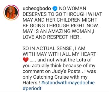 "SO IN ACTUAL SENSE , I AM WITH MAY WITH ALL MY HEART ….. and not what the Lots of you actually think because of my comment on Judy’s Posts . I was only Catching Cruise with my Haters ! #istandwithmayedochie #periodt"