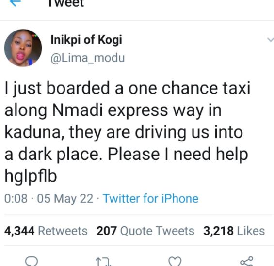 The woman who raised alarm after she boarded a "one-chance" taxi in the early hours of today and was taken to a dark place in Kaduna has finally spoken about her unfortunate ordeal in the hands of the criminals.