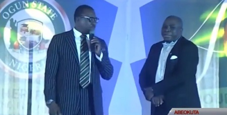 Top comedians Alibaba and Gbenga Adeyinka, while entertaining President Buhari and other top dignitaries at the 40th Presidential Luncheon to mark Ogun state's 40th anniversary in Abeokuta yesterday February 2nd, joked about the current Dasuki $2.1 billion arms deal probe.
