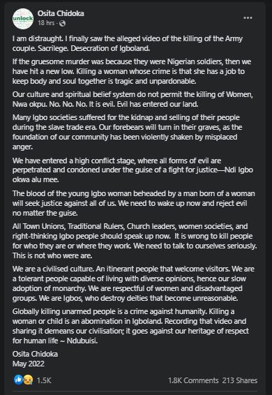 ''I am distraught. I finally saw the alleged video of the killing of the Army couple. Sacrilege. Desecration of Igboland.