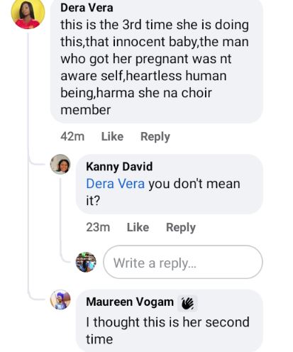 "This is the 3rd time she is doing this. That innocent baby, the man who got her pregnant was not aware sef. Heartless human being. Harma she na choir member." one Dera Vera wrote.