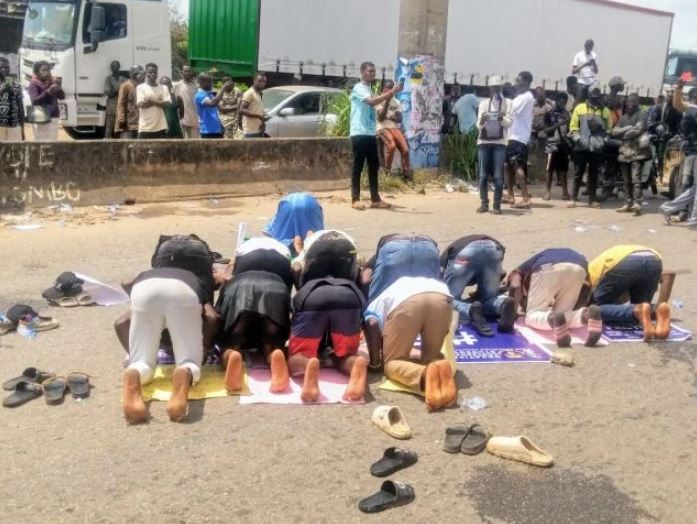 On Thursday, the 12th of May 2022, the protesting students of Obafemi Awolowo University, Ile-Ife, Osun State, denied leaving the barricades for the mosque as the Muslim students were seen observing their prayer on the express road.