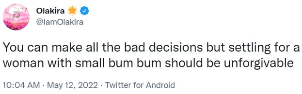 He tweeted; You can make all the bad decisions but settling for a woman with small bum bum should be unforgivable