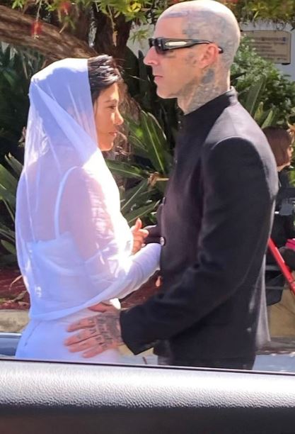 Kourtney who rocked a white minidress and veil joined her husband Travis in a convertible and they drove off with a "Just Married" sign.