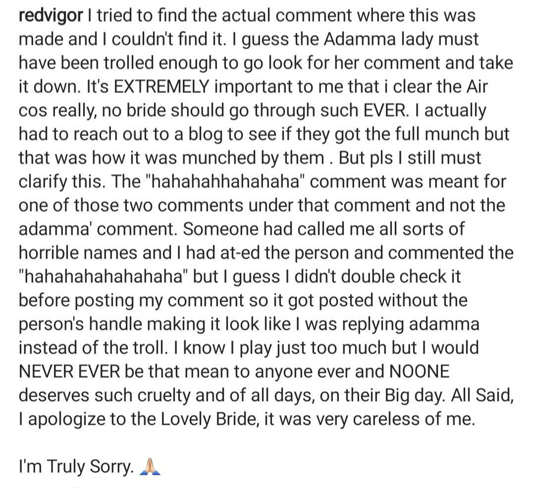 In a post she shared on her page this morning, Maureen apologized and also clarified that her comment wasn't directed at Ehinome. According to her, no bride needs to be trolled on her big day.