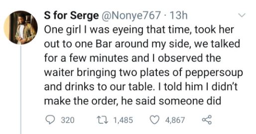 He explained that he was on the date with the woman at a restaurant when a waiter approached their table with two plates of pepper soup and drinks.