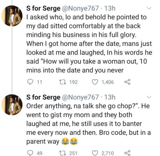 A Twitter user has recounted how his father came through for him after he took a lady out on a date.