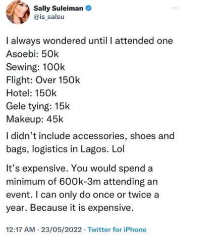 A humanitarian identified as Sally Suleiman has taken to Twitter to disclose how much it costs her to attend an Owanbe in Lagos.