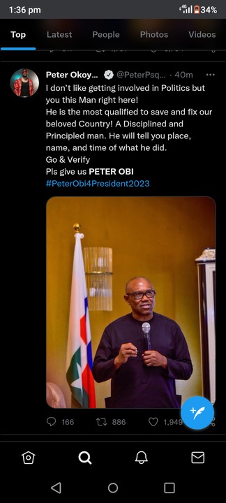 The singer took to his Twitter page to endorse, former Anambra state governor, Peter Obi.