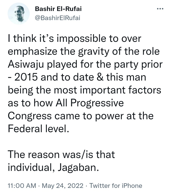 I think it’s impossible to over emphasize the gravity of the role Asiwaju played for the party prior - 2015 and to date & this man being the most important factors as to how All Progressive Congress came to power at the Federal level.