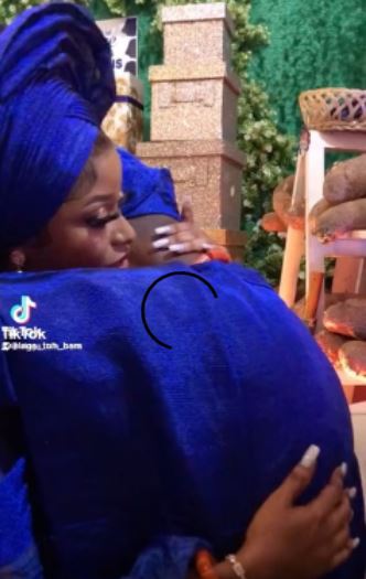 The man held on to his bride tightly, and she reciprocated and also called on someone to bring a tissue which she used in cleaning his eyes.