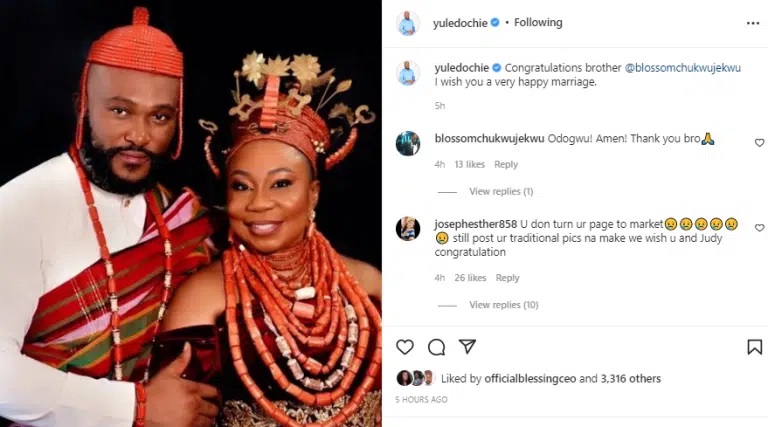 Nollywood actor Blossom Chukwujekwu has reacted after being congratulated on his recent wedding by actor, Yul Edochie.