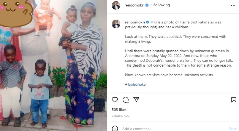 Reno who posted the photo online said the woman named Harira Jibril was in the state visiting some of her relatives when she was killed alongside her children in Isulo, Orumba North local government area of the state.