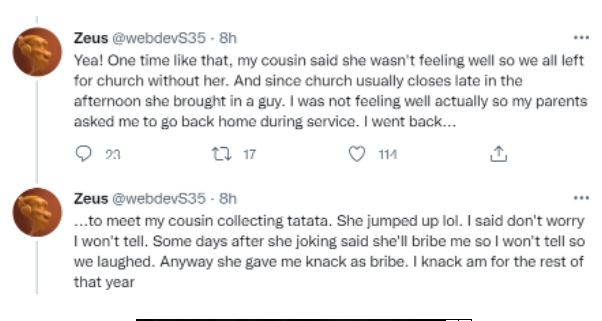 I went back to meet my cousin collecting tatata. She jumped up lol. I said don't worry I won't tell. Some days after she joking said she'll bribe me so I won't tell so we laughed. Anyway she gave me knack as bribe. I knack am for the rest of that year.''