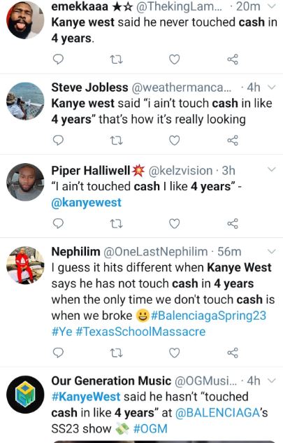 Kanye responded: "I ain't, no, I ain't touched cash in like four years."