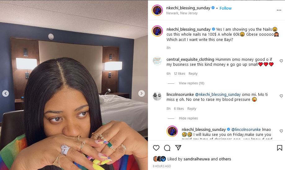 Nigerian actress and brand influencer, Nkechi Blessing has splashed the sum of sixty thousand naira on her nails.