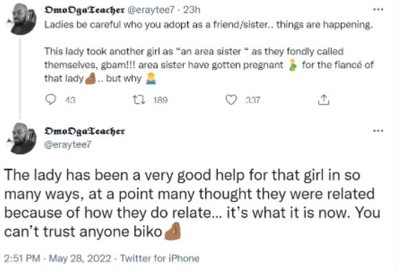 ''Ladies be careful who you adopt as a friend/sister.. things are happening. This lady took another girl as “an area sister “ as they fondly called themselves, gbam!!! area sister have gotten pregnant for the fiancé of that lady.. but why