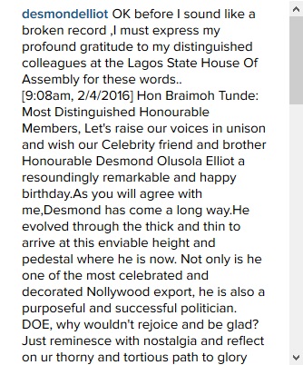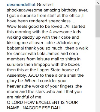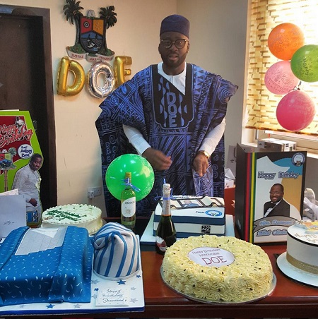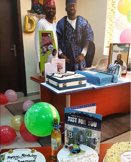 Popular Nollywood actor-turned politician, Desmond Elliot, who turned 42 today, came to his office this morning to meet a surprise lavish and colourful birthday party.