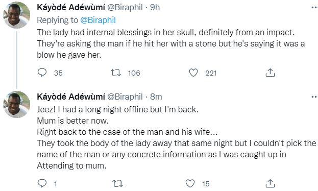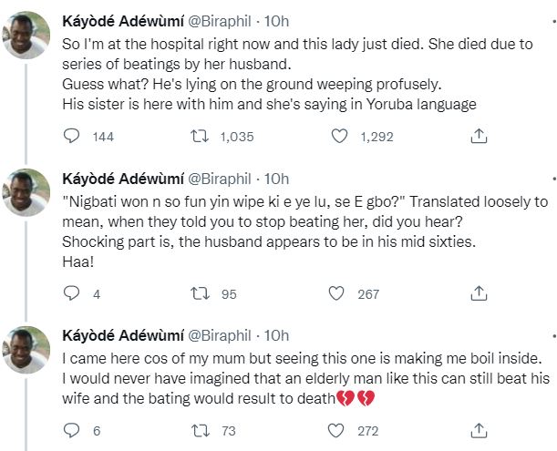A witness, identified as @Biraphil on Twitter, said he was in the hospital to see his mum when he ran into the husband wailing after he was informed of his wife's passing.