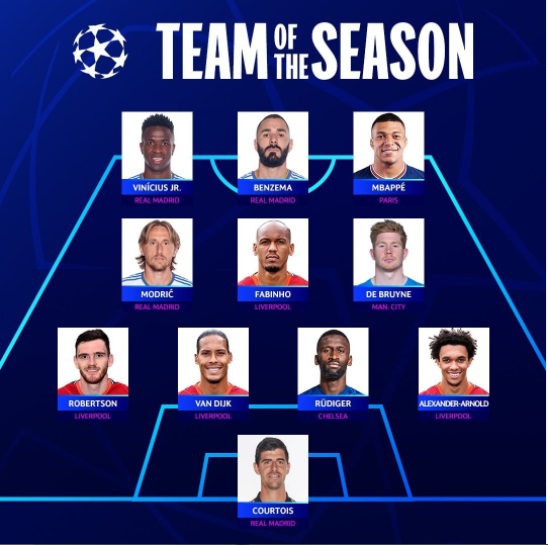 The list revealed on Tuesday, May 31, was dominated by Liverpool (Trent Alexander-Arnold, Virgil van Dijk, Andy Robertson, Fabinho) and Real Madrid ( Thibault Courtois, Luka Modri?, Karim Benzema, Vinícius Júnior) as they had four each on the list following their Champions League final clash which the Spanish side won 1 - 0